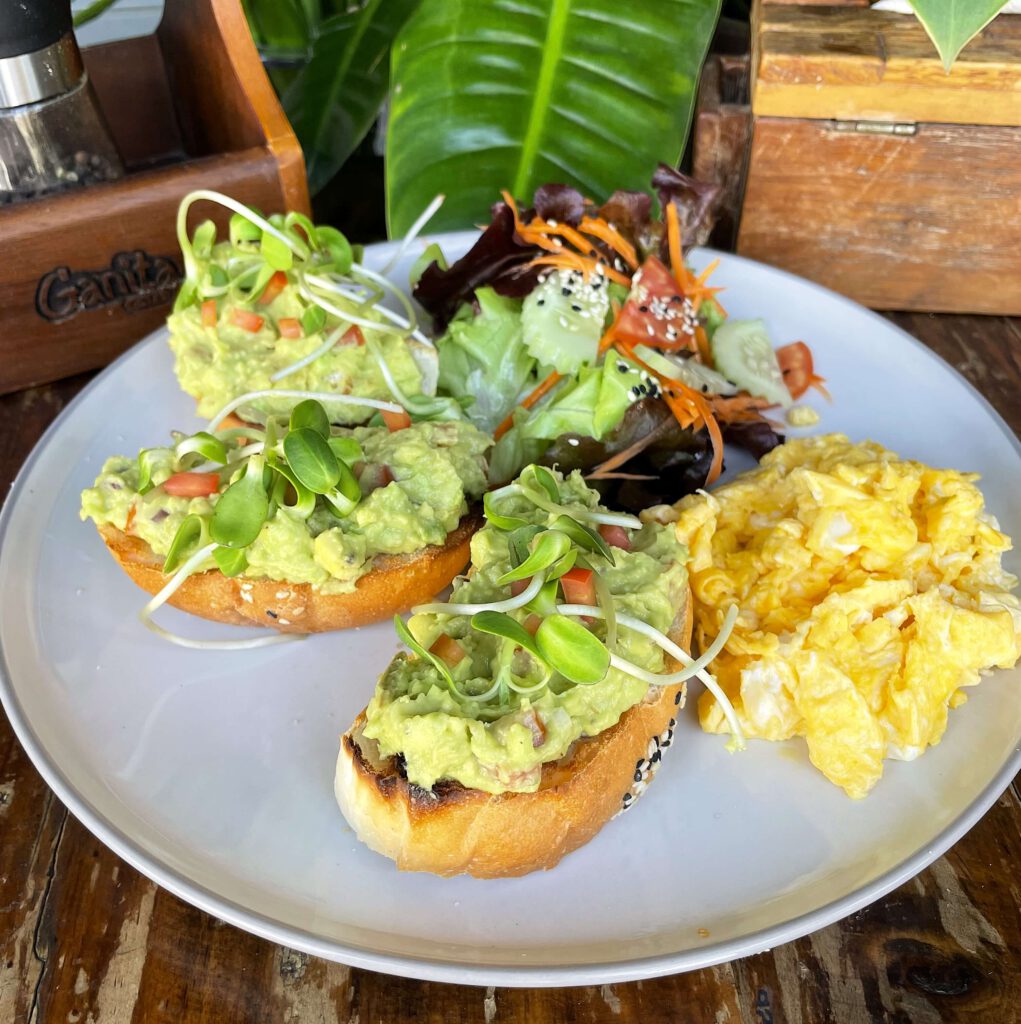 toasted bread with guacamole spread (avocado with lime, tomato and onion) and side salad – 130 B