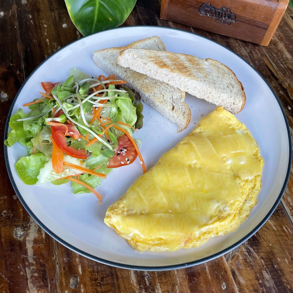 omelette baked with mild Edam cheese slices, served with toast and small side salad – 100 B