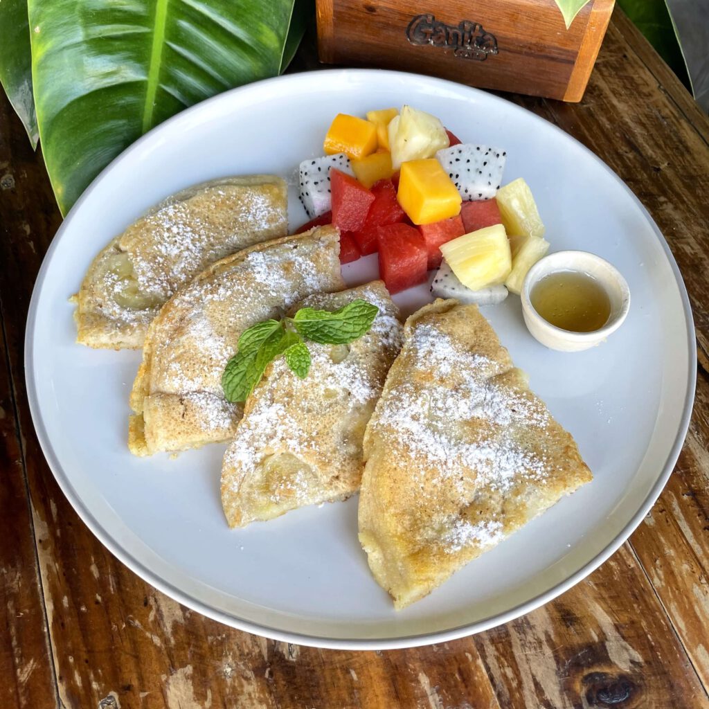 pan baked milky dipped toasts with seasonal mixed fruits, topped with cinnamon and honey – 125 B