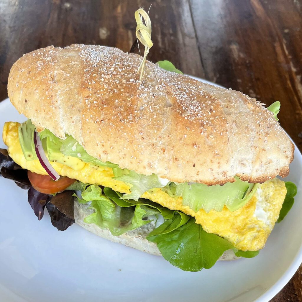 bread roll with plain omelette, tomato, lettuce, cucumber, onion and veganaise – 110 B